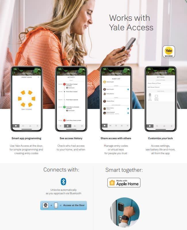Let Yale get the door with the Yale Assure Lock 2. With multiple ways to unlock, the ability to easily share and track entry codes and advanced Auto-Lock with DoorSense(R), this Bluetooth smart lock gives you one less thing to worry about. With built-in Bluetooth, you can easily check that the door is locked, see if the dog walker came on time and receive a notification when the kids get home from school when you're away from home, using the Yale Access App. KEY FREE ACCESS:Choose yourown way to unlock, whether it's the keypad, voice assistant, Auto-Unlock or the Yale Access App on your smartphone or Apple Watch. Looking for remote access? Purchase a Yale Wi-Fi Smart Module (sold separately). SECURE:No more worrying if the door is locked, Yale can be set to Auto-Lock once DoorSense® detects that the door is closed. And withTwo-factor authentication, biometric verification and matte keypads for fingerprint resistanceyou can be comfortable knowing only the correct people will be able to access your home. EASY:With optional Auto-Unlock, you have the choice to let Yale get the door. With this option enabled there is noneed to touch the lock, or your phone. Unlimited access codes makes expecting company a breeze ACCOUNTABLE:Unlimited access codes makes expecting company a breeze. And the ability to monitoryour home has never been easier by usingthe Yale App to trackwho is using the access codes and when. SMART HOME COMPATIBLE:This product works with Apple Homekit: Easily manage the lock along with your smart lighting, speakers, thermostats and more, all from the Apple Home app or using Siri. Access remotely when you have an Apple TV, iPad or HomePod set up as a hub