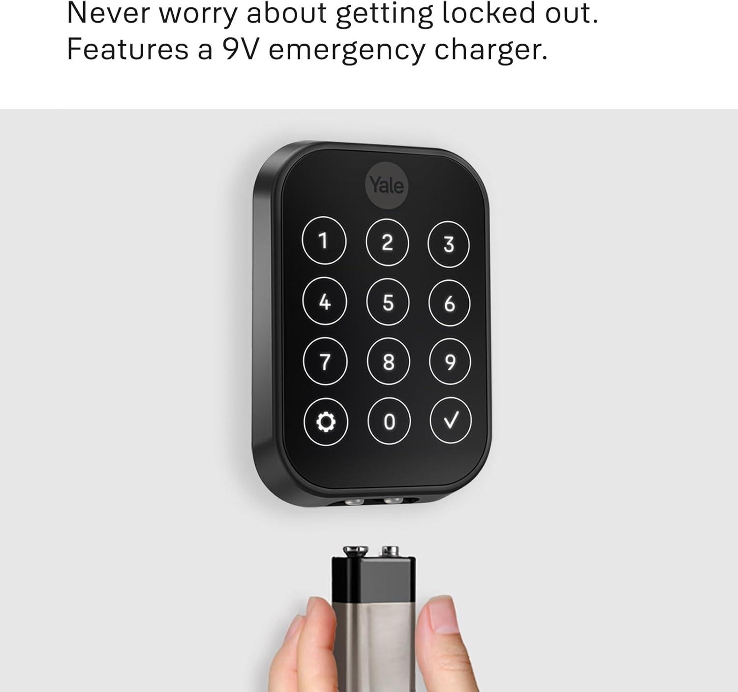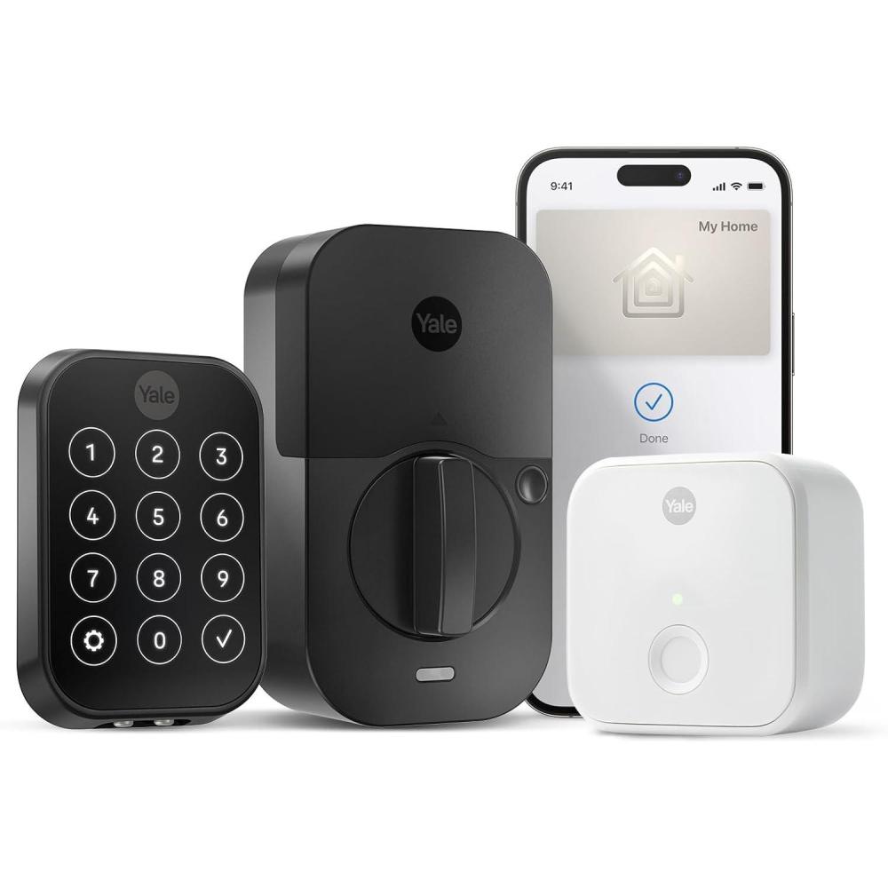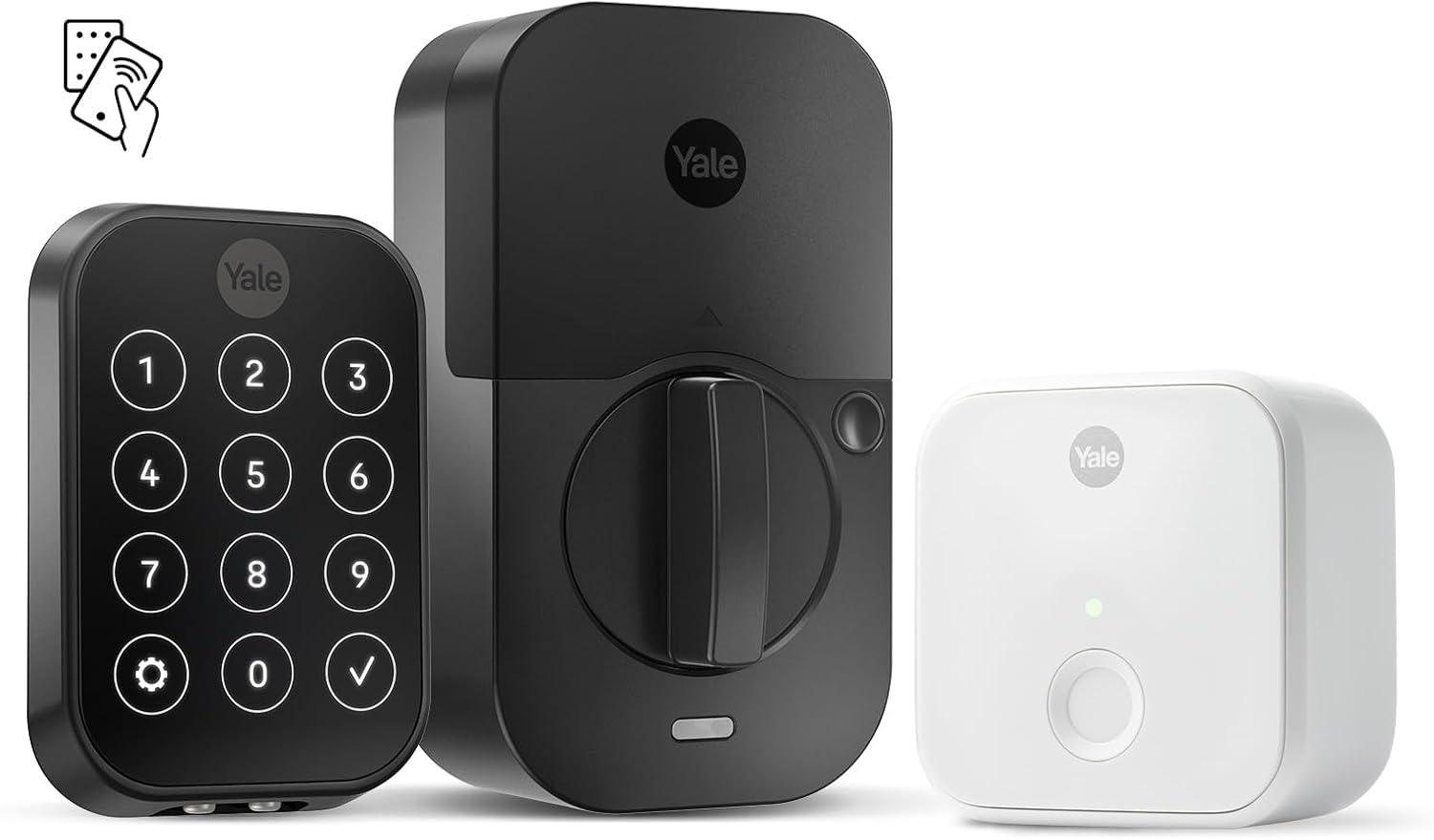 YOU'VE GOT ENOUGH ON YOUR PLATE, let Yale get the door with the Yale Assure Lock 2 Plus. The ultimate smart device for vacation rental hosts, using platforms like Airbnb, this lock allows your guests an easy and convenient check-in process that no longer calls for them to return keys or for you to change lockbox codes. With the Yale Access app or compatible partner apps, share a temporary and unique door code with guests that remains valid for the duration of their stay. With advanced Auto-Lock with DoorSense, never worry again about your guests remembering to lock or close the door. A Yale Connect Wi-Fi Bridge is included in this bundle, letting you enjoy app access from anywhere and extended battery life for your smart lock. Using the app's Activity Feed, ensure that your guests are checking in on time even if you're not there to let them in. For times when you're visiting, access your vacation home using Apple home keys*- a simple tap with your iPhone® or Apple Watch® is all it takes to lock or unlock your door. Whether it's a ski house or a beach house, this lock is IPX5 rated and works in temperatures from -22 to 140F, making it a perfect choice for any home. *To use home keys, iPhone® XS or later with iOS 15 or later and Apple Watch® Series 4 or later with watchOS 8 or later are required. For more than one user to have a Home Key, a HomePod, HomePod mini, or Apple TV set up as a home hub is required. Sharing a home key requires sharing access to your whole Apple Home. On the new Apple Home architecture a home hub, such as Apple TV or HomePod, is required to share control of your home and to receive Home notifications. iPad is not supported as a home hub on the new Home architecture.. For more information from Apple, please visit apple.com. This product works with 2.4 GHz Wi-Fi and in the U.S. and Canada.