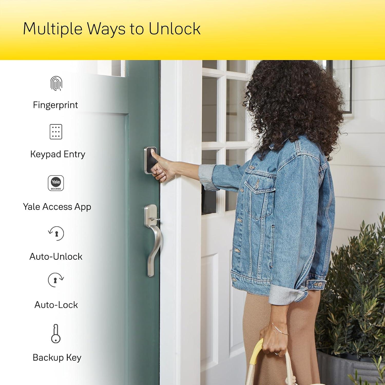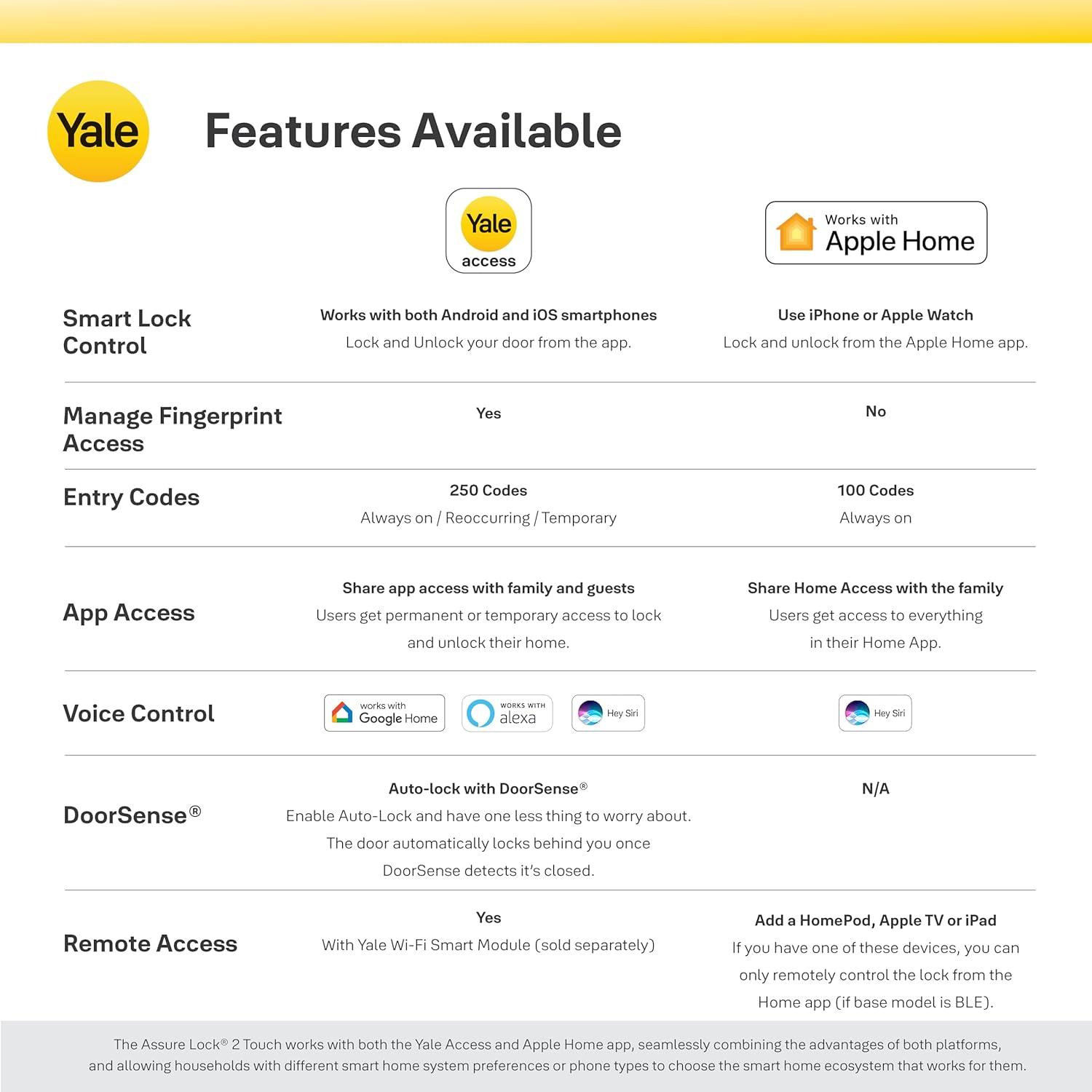 YALE ASSURE 2 TOUCH. A LOCK AS UNIQUE AS YOU. Make coming home more seamless than ever with the Yale Assure Lock 2 Touch. Thanks to the new biometric touchpad, a simple touch of your finger is all it takes. Explore all the different ways to access including hands-free Auto-Unlock, or using your phone or Apple Watch. Let Yale get the door for your trusted network with fingerprint or easily create unique entry codes or virtual keys from the Yale Access App. For added peace of mind, never worry about locking the door behind you with advanced Auto-Lock and DoorSense(R). This product will not work outside of the US or Canada.