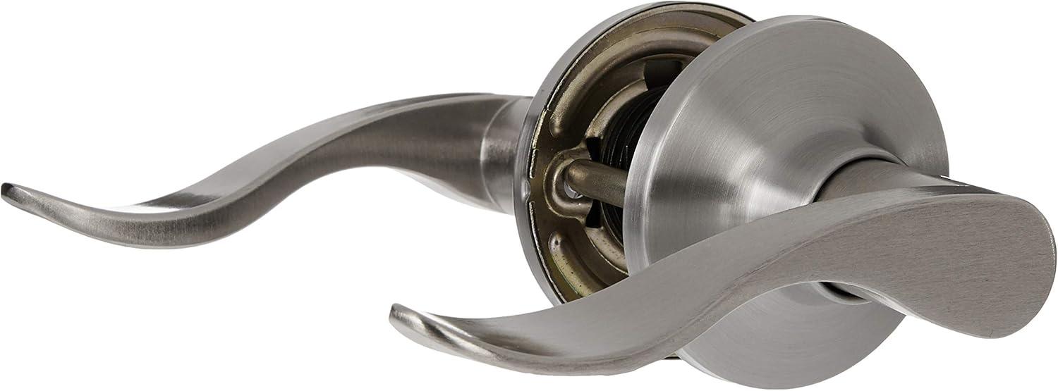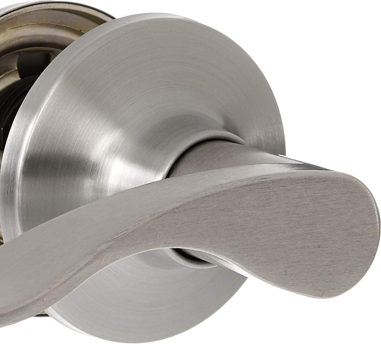 Satin Nickel Passage Lever. Latch bolt is operated by either knob at all times. (non-handed). Easy install mounting system.